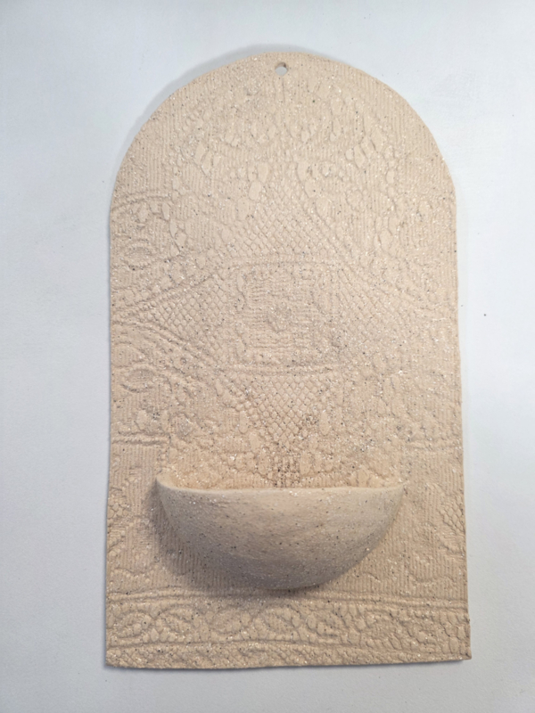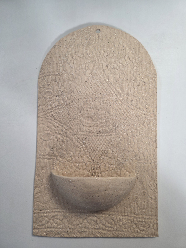Kant-reliëf: Het keramiek is voorzien van een prachtig, fijnmazig reliëf dat doet denken aan klassiek kantwerk. Dit geeft het object een zachte en romantische uitstraling.