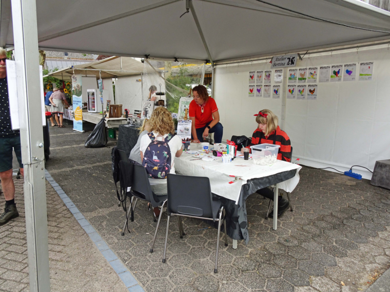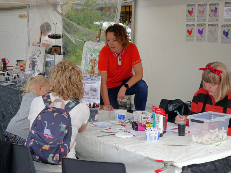 Er was een tafel aanwezig die speciaal voor kinderen was aangekleed. Er lagen met verf gevulde schilderspaletten inclusief kwasten en er stonden waterbakjes klaar om de kwasten in te dopen. Ook waren er voldoende stoelen aanwezig, waarover schortjes klaarlagen. Talloze kinderen, vergezeld door hun vader en moeder, maar ook door enthousiaste grootouders, lieten hun creativiteit de vrije loop aan de lange tafel, waar ze haantjes van klei konden schilderen of een kleurplaat mochten maken. De kinderen die meedoen aan de tekenwedstrijd, kunnen tot 1 september hun creatie inleveren bij Atelier-Bertina, want daarna wordt de winnaar bekendgemaakt.