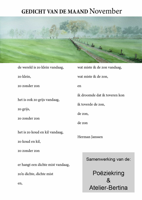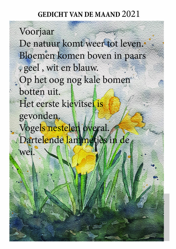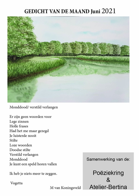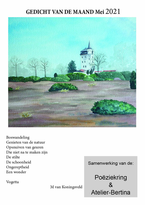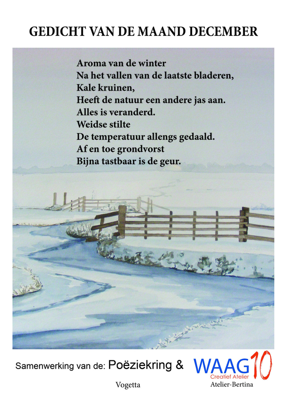 Het eerste ‘gedicht van de maand’ is een feit. Een mooi gedicht van Annete Kiekebosch bij een aquarel van Bertina Tilma. De gedichten en de kunstwerken zijn te zien bij de Waag 10.