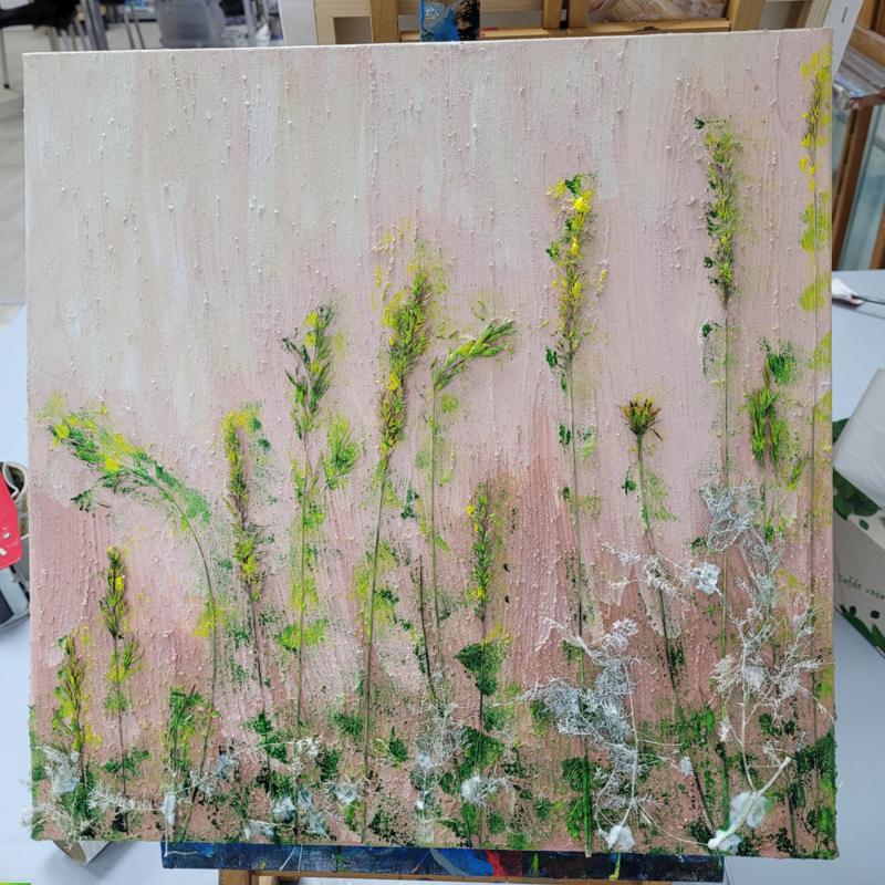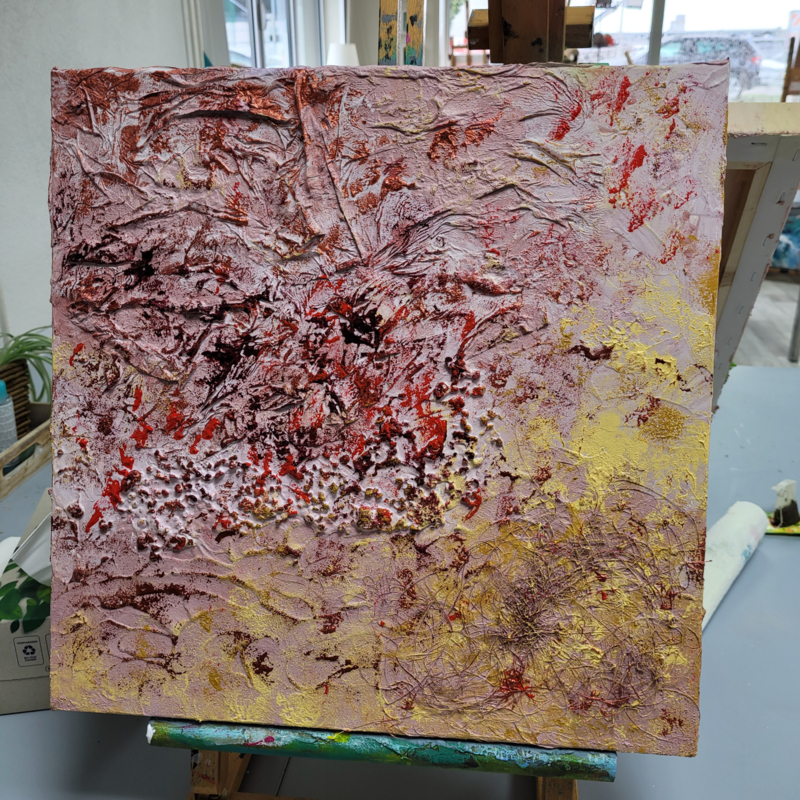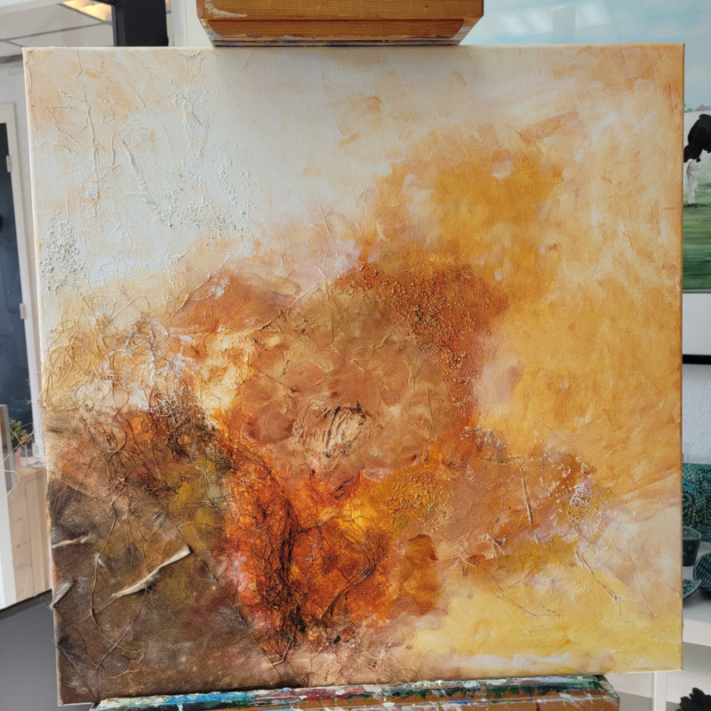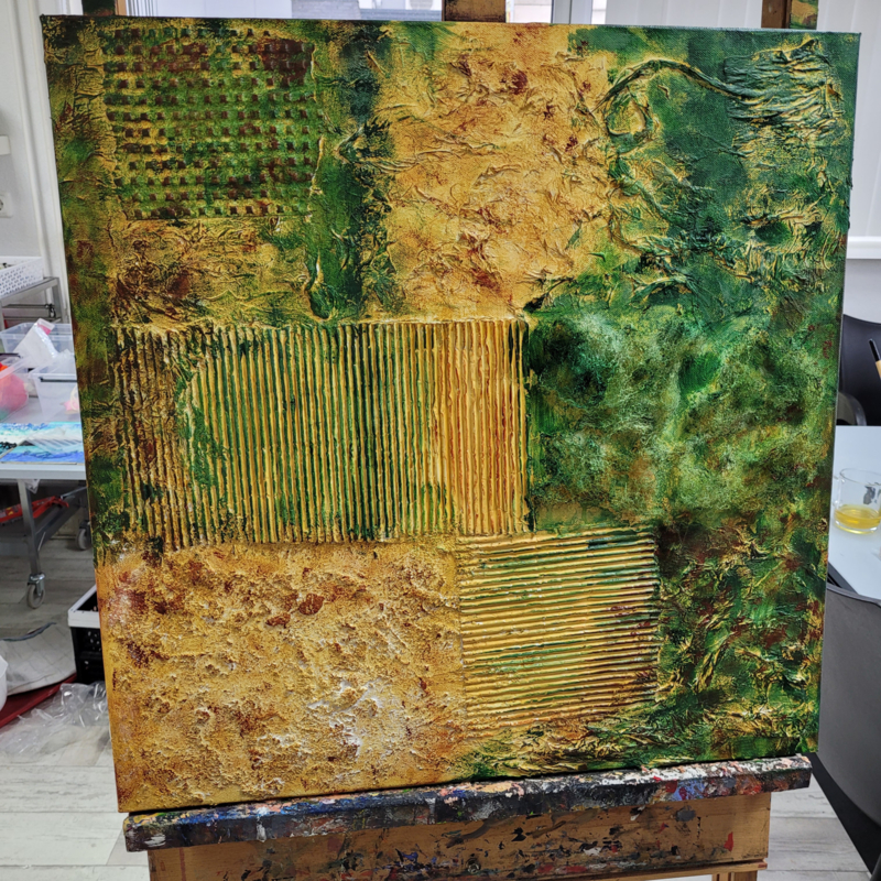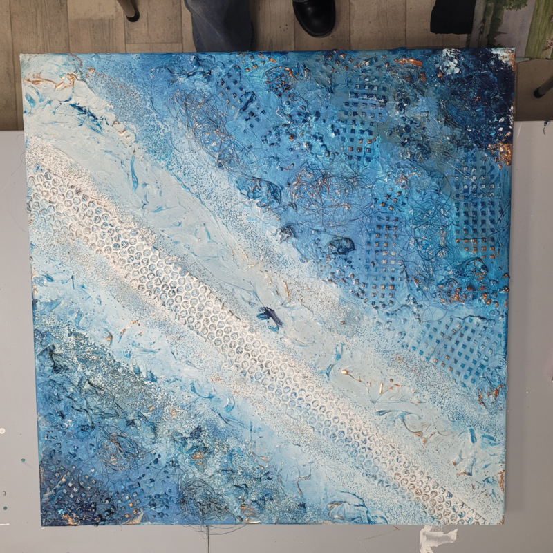 We bouwen het schilderij op met de favoriete kleuren en kiezen voor structuren en texturen. Het schilderij ontstaat vanuit je gevoel en intuitie en hoeft geen onderwerp te hebben. Iedereen kan dit.