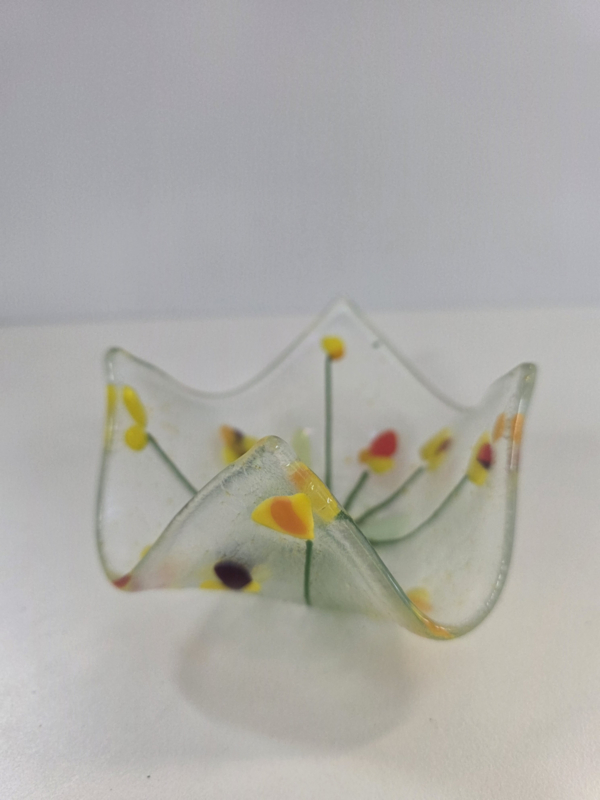 Dit lichtje brengt sfeer. Sfeerlichtje van glas bestaat uit een glazen waxinlichtje houder en daarop een glasfusion kunstwerkje.